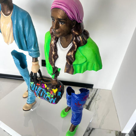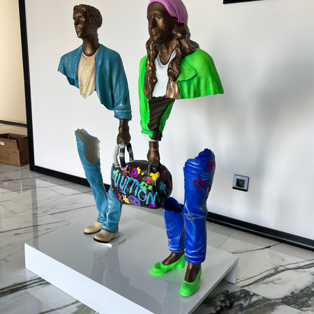 Cette sculpture d'un couple de voyageurs de 110cm de haut a été commandée par Patrick de Nice, passionné d'art et souhaitant imiter les plus grands en utilisant les technologies modernes.